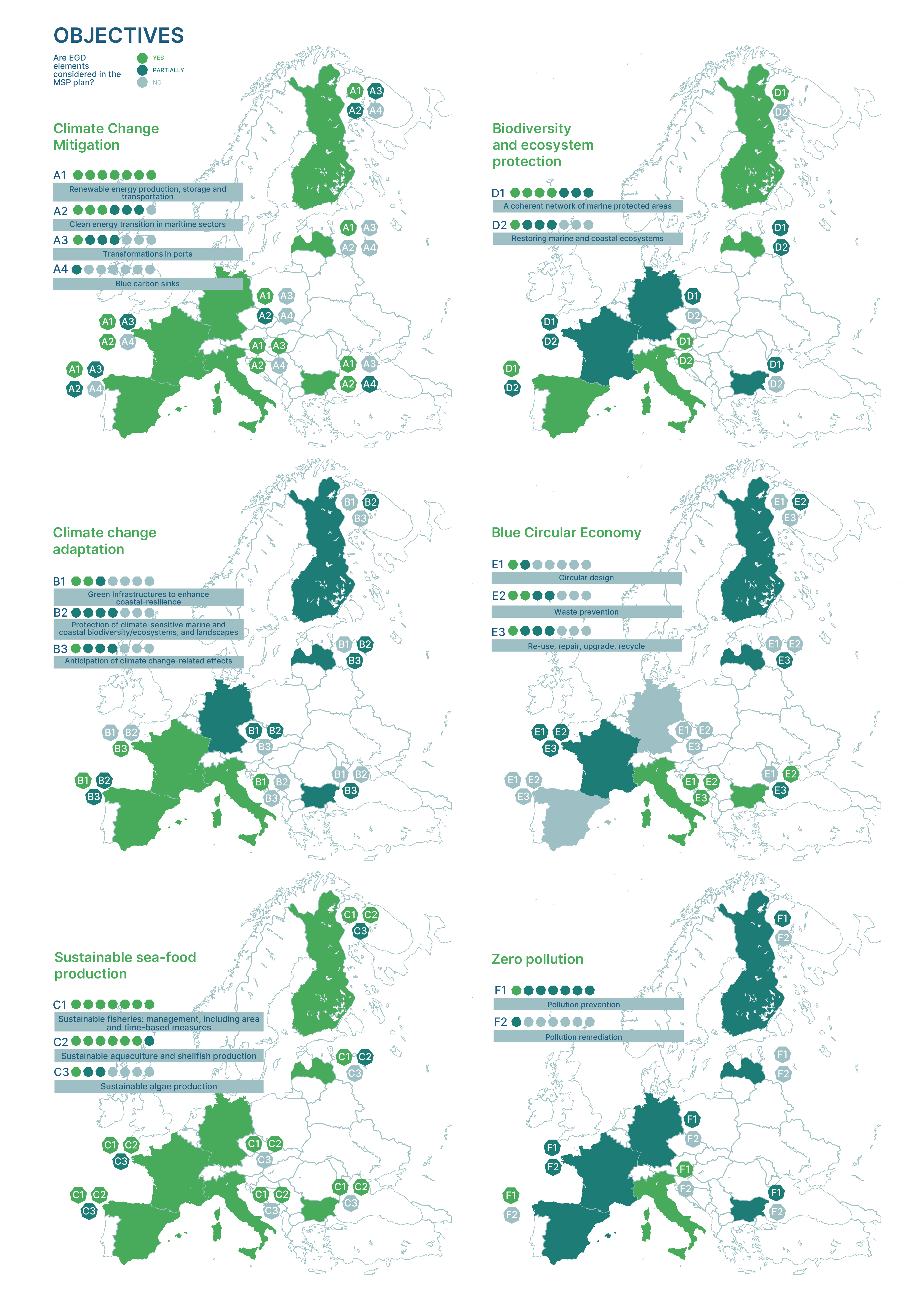 The European Green Deal (EGD) sets an ambitious, cross-sectoral agenda with direct implications for the sea. Yet methods to systematically assess how national Maritime Spatial Plans contribute to EGD objectives remain scarce. The article proposes an EGD–MSP nomenclature that translates the EGD's complexity into a practical, adaptable framework for practical application in Maritime Spatial Planning. The framework clusters EGD ambitions into seven topics—climate change mitigation, climate change adaptation, sustainable seafood production, biodiversity and ecosystem protection and restoration, blue circular economy, zero pollution, and fair and just transition—and organises them hierarchically into sub-topics and operational elements. The nomenclature was tested across seven EU countries (Bulgaria, Finland, France, Germany, Italy, Latvia, Spain) using desk analysis of MSP plans and related documents, targeted interviews, and a workshop to examine aspects common to the participating countries. A semi-quantitative synthesis (YES/PARTIALLY/NO) enabled consistent comparison of how EGD elements appear in MSP visions, objectives, and measures. Results show that climate change mitigation is widely and explicitly addressed—primarily via offshore renewable energy—while adaptation is present but often indirect. Biodiversity protection is common, whereas restoration remains limited. Blue circular economy and zero-pollution objectives are referenced more often in objectives than in concrete measures. Approaches to a fair and just transition are emerging, with participation and transparency improving, yet institutional, financial and technical knowledge capacities remain uneven. The nomenclature balances harmonisation and interpretative flexibility, enabling robust cross-national comparisons without imposing uniformity. Beyond analysis, it provides a practical scaffold for implementation, monitoring, and iterative plan revision, and can be extended into an indicator-based system to track MSP contributions to the EGD over time.